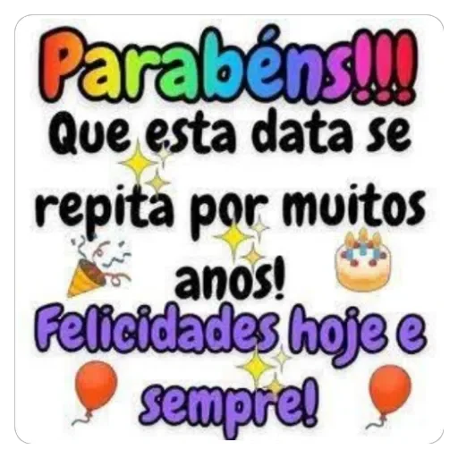 Um cartão de aniversário colorido com o texto 'Parabéns!!! Que esta data se repita por muitos anos! Felicidades hoje e sempre!' em preto e roxo, com balões vermelhos, um bolo de aniversário e um chapéu de festa.