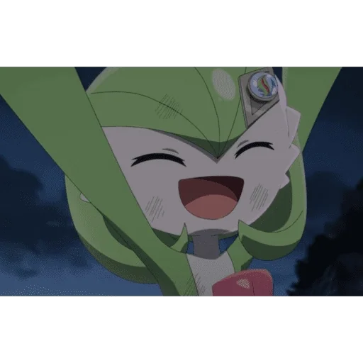 Personagem de anime com cabelo verde e olhos fechados, sorrindo com a boca aberta, contra um fundo escuro.