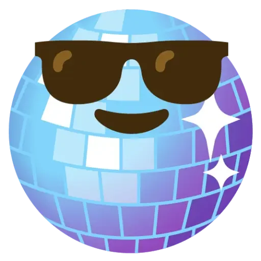 Uma bola de discoteca com óculos de sol e um sorriso, feita de azulejos coloridos que mudam de azul para roxo.