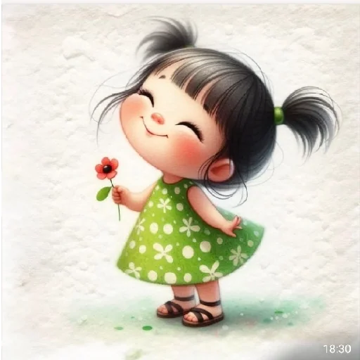 Menina de cabelos pretos em dois coque, com vestido verde e branco, sorrindo e segurando uma flor vermelha.
