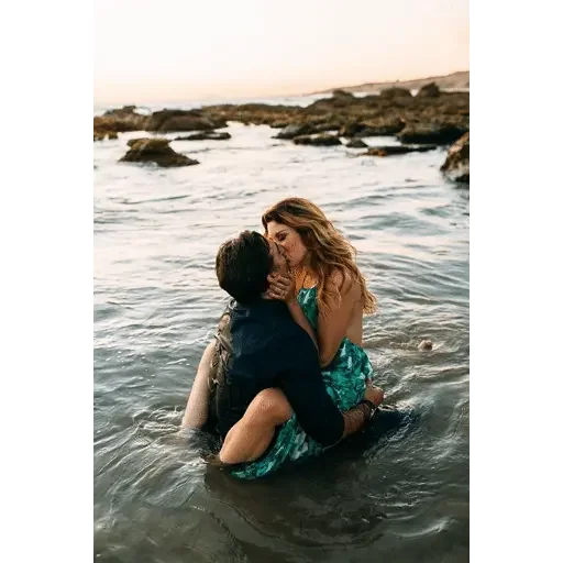 Um casal se beija na água rasa do mar, com rochas ao fundo e o pôr do sol no horizonte. A mulher usa um vestido verde, e o homem veste uma camisa escura.