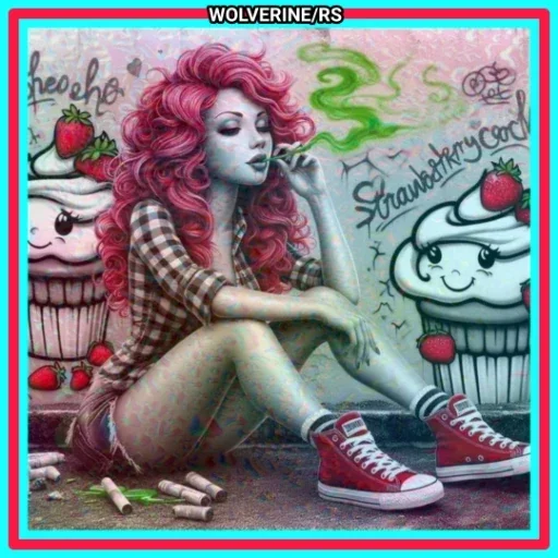 Uma mulher com cabelos rosa e um xadrez sentada em frente a um muro com grafites, com um cigarro na mão. Ela está usando tênis vermelhos e meias listradas.
