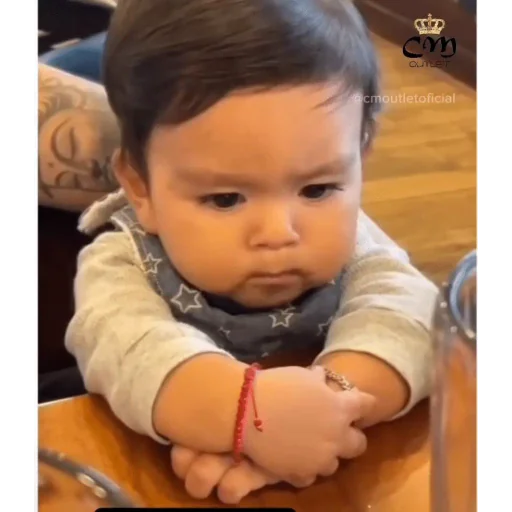 Um bebê com expressão séria, usando um bib e uma pulseira vermelha, com os braços cruzados em uma mesa de madeira.