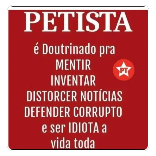 Um quadrado vermelho com o texto 'PETISTA é Doutrinado pra MENTIR INVENTAR DISTORCER NOTÍCIAS DEFENDER CORRUPTO e ser IDIOTA a vida toda' em branco. Uma estrela branca em um círculo vermelho ao lado.