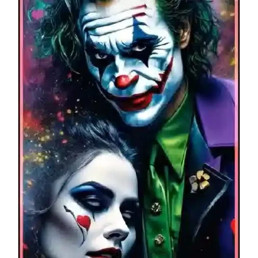 Joker e Harley Quinn se beijando, com maquiagem colorida e expressões alegres. O Joker tem um sorriso largo e dentes…