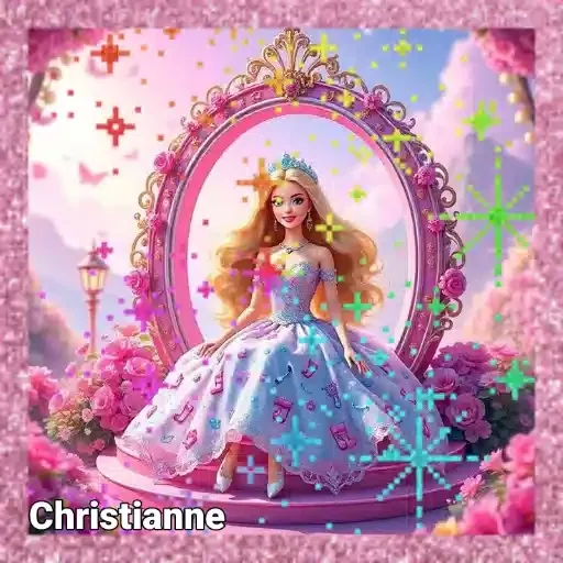 Uma boneca Barbie loira com vestido azul e rosa sentada em frente a um espelho decorado, cercada por flores e estrelas coloridas. O nome 'Christianne' aparece no canto inferior esquerdo.