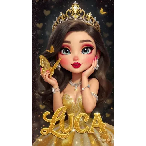 Uma princesa de olhos azuis e cabelos castanhos, vestida com um vestido dourado e uma coroa, segurando um objeto dourado, com o nome 'LUCA' em letras douradas na parte inferior.