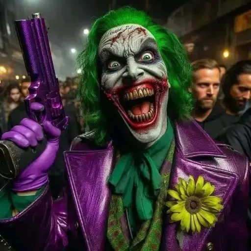 O Coringa com uma arma roxa, cabelos verdes e um sorriso maníaco, usando um casaco roxo e uma camisa verde, com uma flor amarela no peito.