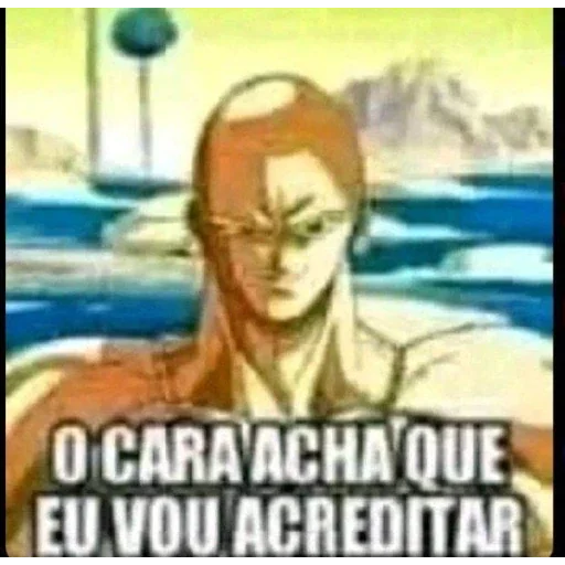 Um personagem de anime com expressão séria e cabelos castanhos, ao fundo cenário de água e montanhas. O texto 'O CARA ACHA QUE EU VOU ACREDITAR' aparece em destaque.