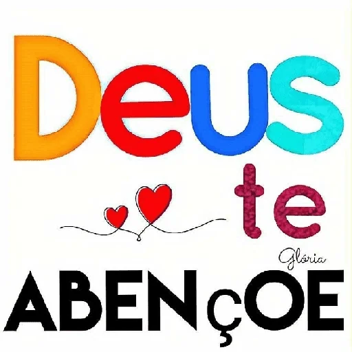 A figurinha mostra a frase 'Deus te abençoe' com letras coloridas. A palavra 'Deus' tem letras grandes em laranja, vermelho, azul e verde. Abaixo, dois corações vermelhos estão ligados por uma linha. Abaixo, 'ABENÇOE' em preto.