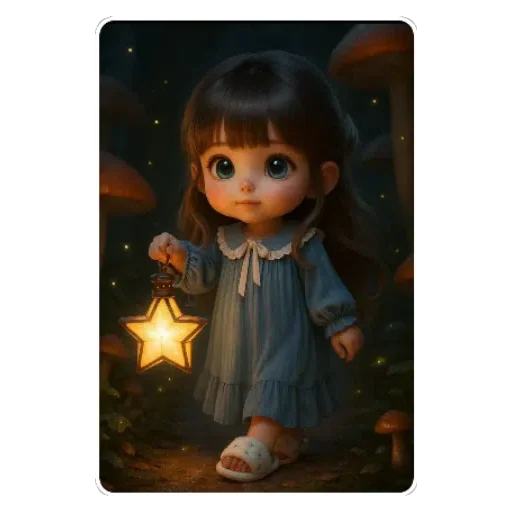 Menina de olhos grandes e cabelos castanhos, vestindo um vestido azul, segura uma estrela brilhante em uma noite mágica com cogumelos ao fundo.
