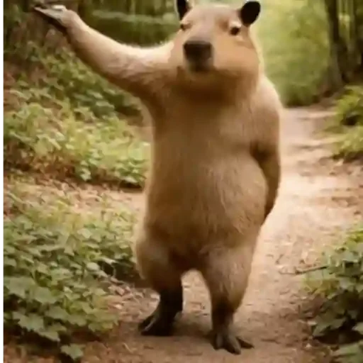Um capivara de pé em uma trilha, com a pata dianteira levantada, parecendo dançar ou cumprimentar. A imagem tem tons de verde e marrom.