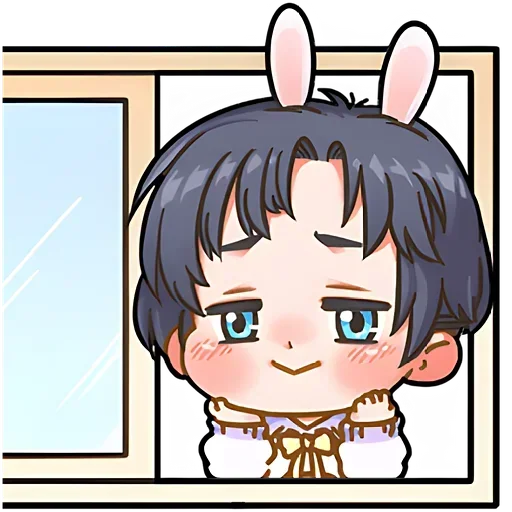 Um menino de anime com orelhas de coelho, cabelo preto e olhos azuis sorri para fora de uma janela.