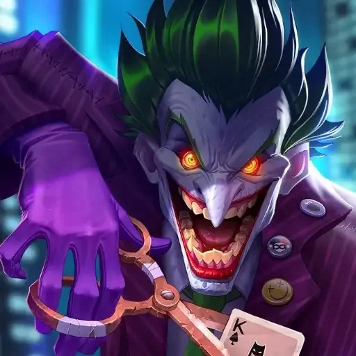 O Coringa com olhos laranja brilhantes e cabelo preto espetado, usando um casaco roxo e luvas roxas, com uma expressão maníaca e um baralho de cartas na mão.