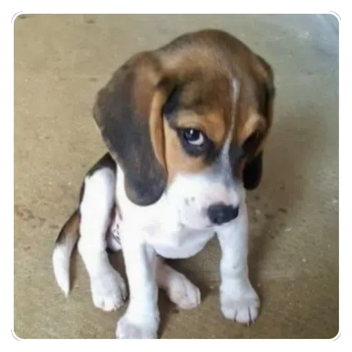 Um filhote de cachorro Beagle sentado em um piso de concreto, com olhar triste e orelhas caídas.
