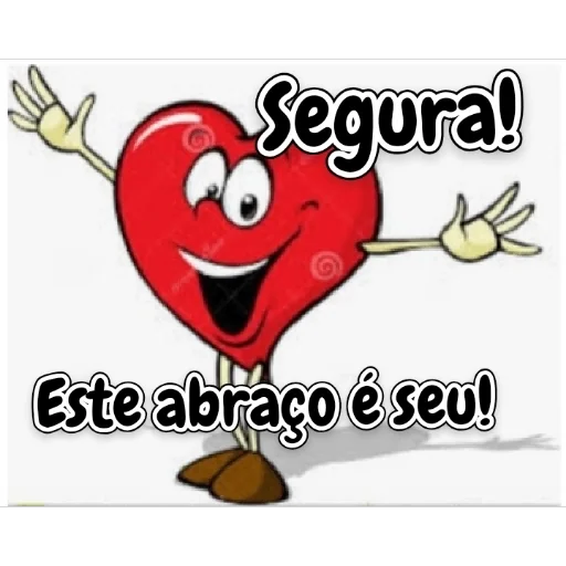 Um coração vermelho animado com um sorriso grande e olhos expressivos, fazendo um gesto de paz com as mãos. Ele diz 'Segura! Este abraço é seu!'.