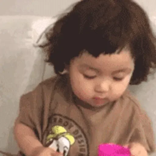 Um bebê com cabelo castanho e uma camisa castanha olha para baixo, com uma expressão neutra, segurando um objeto rosa.
