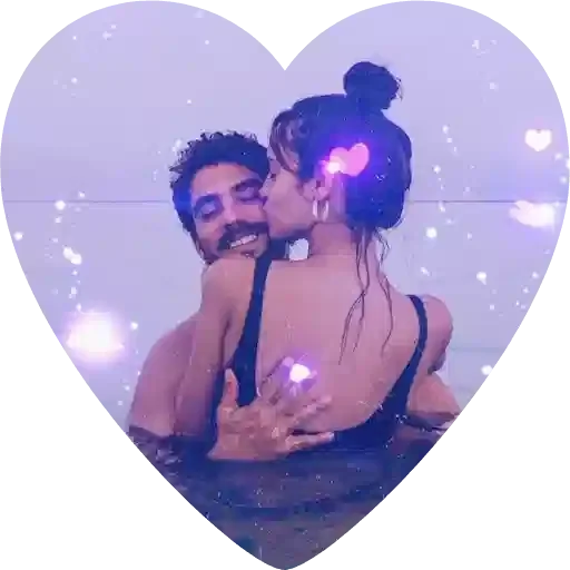 Um casal se beijando, com o homem ao fundo e a mulher na frente, ambos com expressão feliz. O fundo é um coração roxo com pontos brancos.