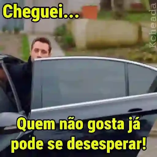 Um homem de cabelos castanhos e expressão séria olha para fora de um carro preto com a porta aberta. Ele é acompanhado pelas frases 'Cheguei... Quem não gosta já pode se desesperar!' em amarelo.
