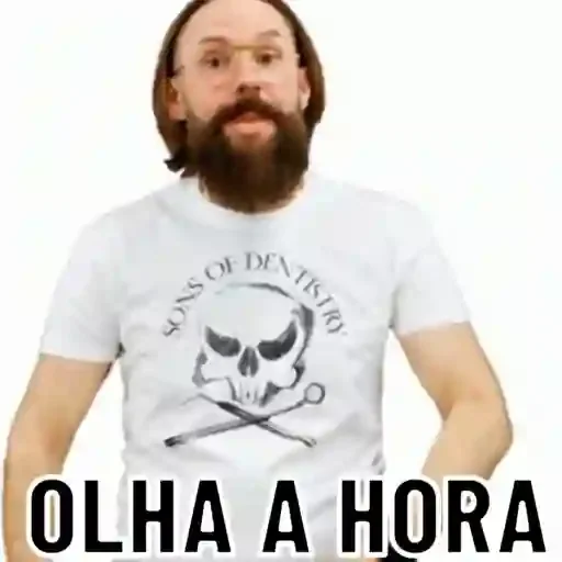 Um homem com barba e cabelo castanho, vestindo uma camiseta branca com um crânio e a frase 'Sons of Anarchy' acima, e 'OLHA A HORA' em letras pretas abaixo.