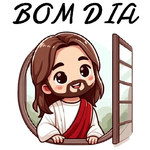 Jesus Cristo com um sorriso, vestindo uma túnica branca e uma faixa vermelha diagonal, olhando para fora de uma janela redonda com a frase 'BOM DIA' acima.