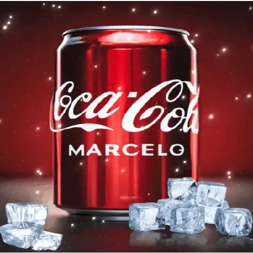 Lata de Coca-Cola vermelha com o nome Marcelo embaixo da logo, rodeada de cubos de gelo e faíscas em fundo vermelho escuro.