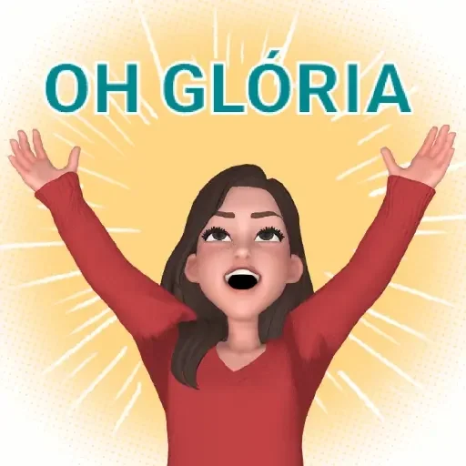 Mulher com os braços levantados e expressão de alegria, vestindo uma blusa vermelha, com o texto 'OH GLÓRIA' acima dela.
