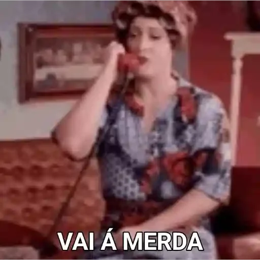 Mulher loira, com expressão de raiva, falando ao telefone. Ela veste uma blusa azul com estampa de flores vermelhas e está sentada em um sofá. A legenda 'Vai à merda' aparece na parte inferior.