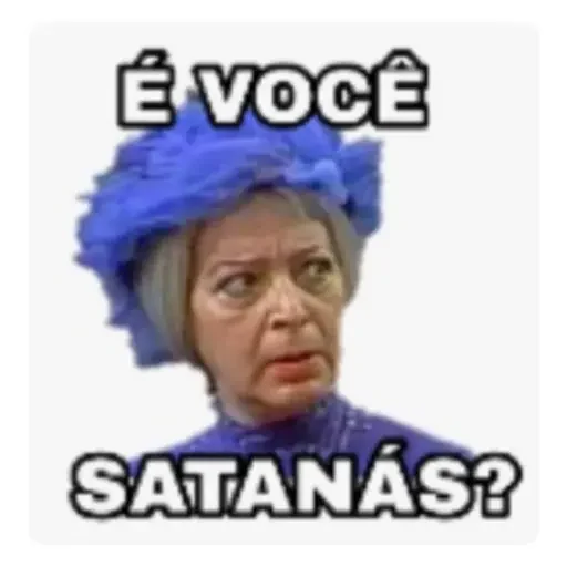 Uma mulher mais velha com um chapéu azul e expressão facial séria, com o texto "É VOCÊ SATANÁS?" sobreposto.