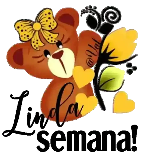 Um ursinho marrom com um laço amarelo no cabelo e um buquê de flores ao lado, com o texto 'Linda semana!' embaixo.