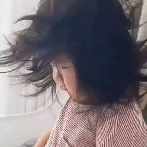 Menina com cabelo castanho e camisa rosa, fazendo careta com os olhos fechados e boca aberta, mostrando os dentes.