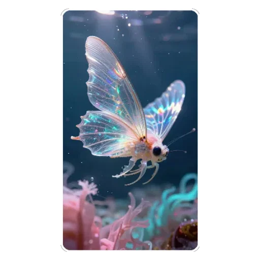 Uma borboleta subaquática com asas translúcidas e iridescentes voa em direção ao lado direito, com um fundo escuro de água e organismos marinhos coloridos.