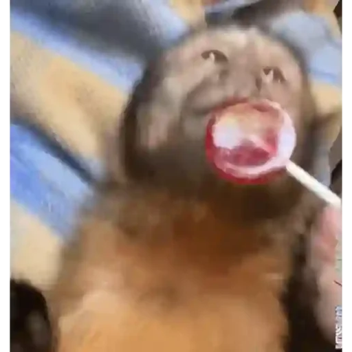 Um macaco com expressão surpresa ou confusa, sugando um pirarucu de cor rosa.