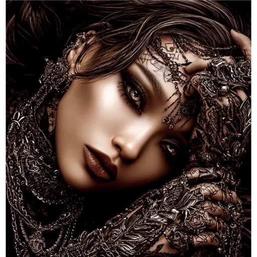 Rosto de uma mulher com maquiagem pesada e cabelo escuro, coberta por uma rede de metal intrincado.