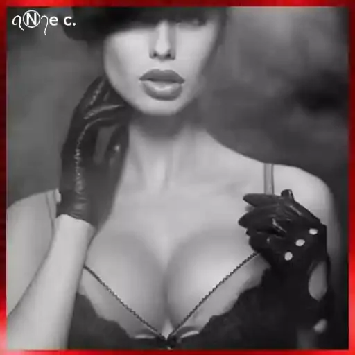 Uma mulher loira com luvas pretas e um vestido decotado, posando com a mão no ombro. A imagem é em preto e branco com uma borda vermelha.