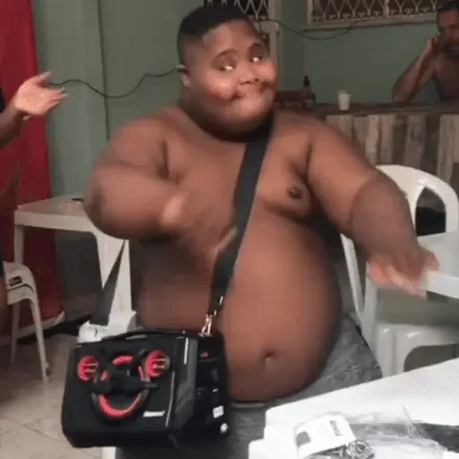 Homem obeso dançando, sem camisa, com bolsa preta sobre o ombro. Fundo com mesa e cadeiras brancas.