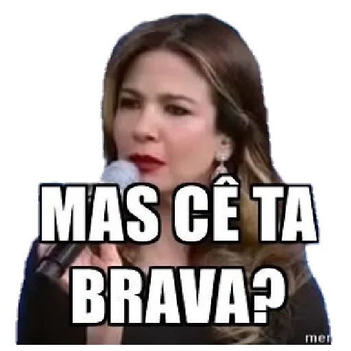 Uma mulher loira com expressão de surpresa, segurando um microfone, com o texto "MAS CÊ TA BRAVA?" sobreposto.