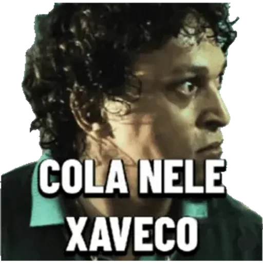 Um homem com cabelo escuro e expressão séria, com o texto 'COLA NELE XAVECO' sobreposto.
