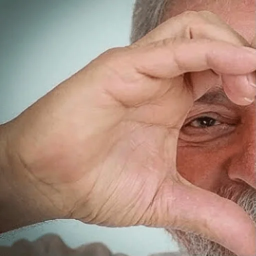 Um homem mais velho fazendo um gesto com a mão perto do olho, parecendo observar algo.