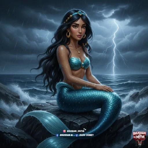 Sereia sentada em uma rocha à beira-mar, com tempestade ao fundo e um raio iluminando o céu escuro. Ela tem longos cabelos pretos e cauda de peixe brilhante em tons de azul.