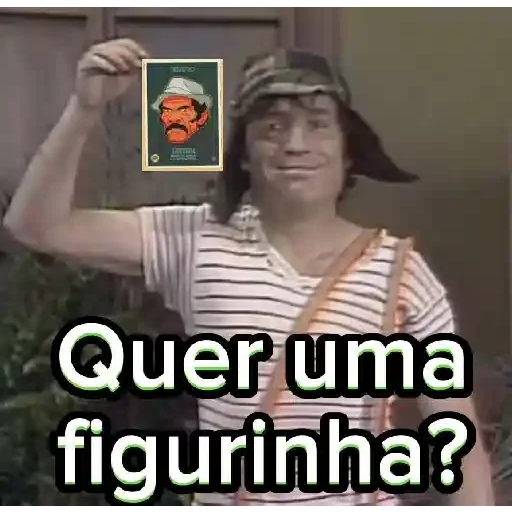 Um homem com camisa listrada e chapéu mostra uma figurinha de um cartão com um rosto de uma pessoa. Ele diz 'Quer uma figurinha?'