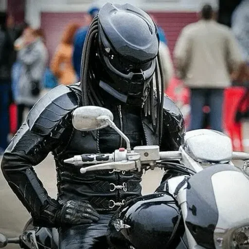 Personagem de ficção científica vestido com traje preto e capacete, parecendo um predador, em uma motocicleta.