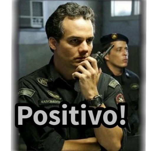 Dois policiais, um com o dedo na boca e o outro ao fundo, com o texto "Positivo!" sobreposto.