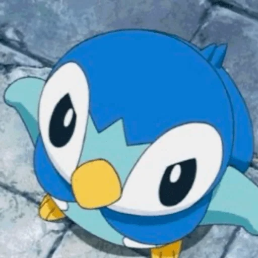 Um pássaro azul de anime com olhos grandes e expressivos, bico amarelo e patas amarelas, em um fundo de pedra.