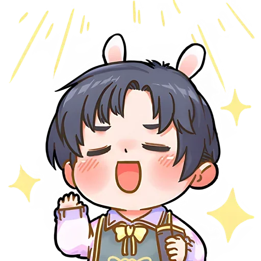 Personagem de anime com orelhas de coelho, cabelo preto e olhos azuis, usando um casaco roxo e amarelo com estrelas…
