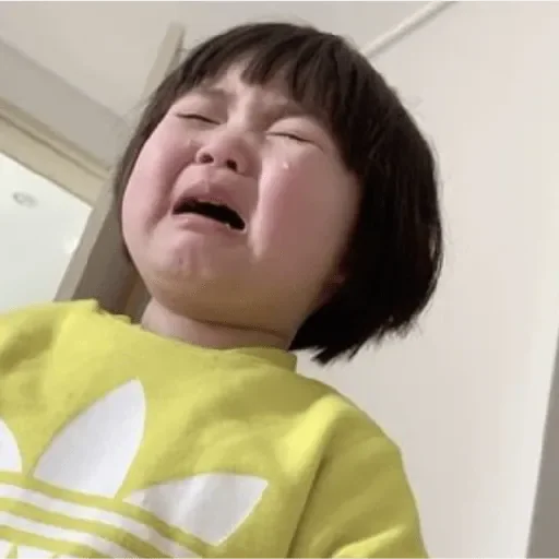 Menina com expressão de choro, usando uma camisa amarela com logotipo branco, em um ambiente com paredes claras.
