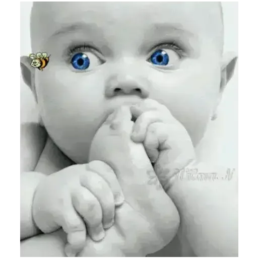 Um bebê com olhos azuis brilhantes e dedo na boca, com um pequeno inseto colorido ao lado da orelha.