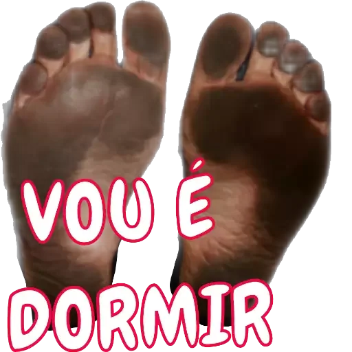 Dois pés com a sola escura e unhas pretas, com o texto "VOU É DORMIR" em letras brancas com contorno vermelho.