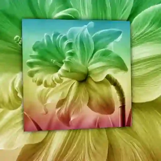 Uma ilustração de uma flor verde com folhas e pétalas, em um fundo colorido que vai do azul ao vermelho.