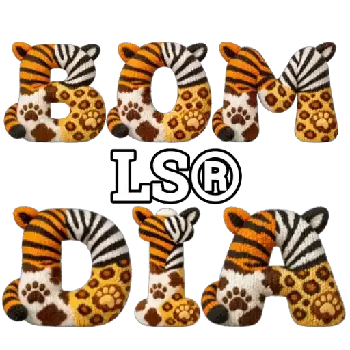 Um 'Bom Dia' estilizado com letras decoradas com padrões de animais, como listras de tigre e manchas de leopardos.